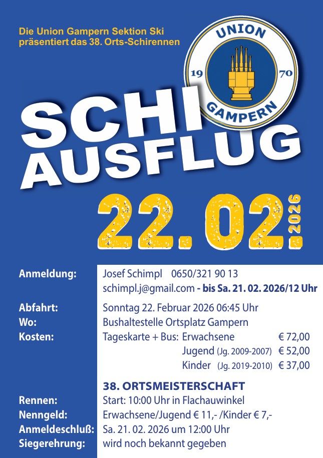 Die Union Gampern Sektion Ski lädt euch herzlich zum 38. Orts-Schiausflug samt Rennen